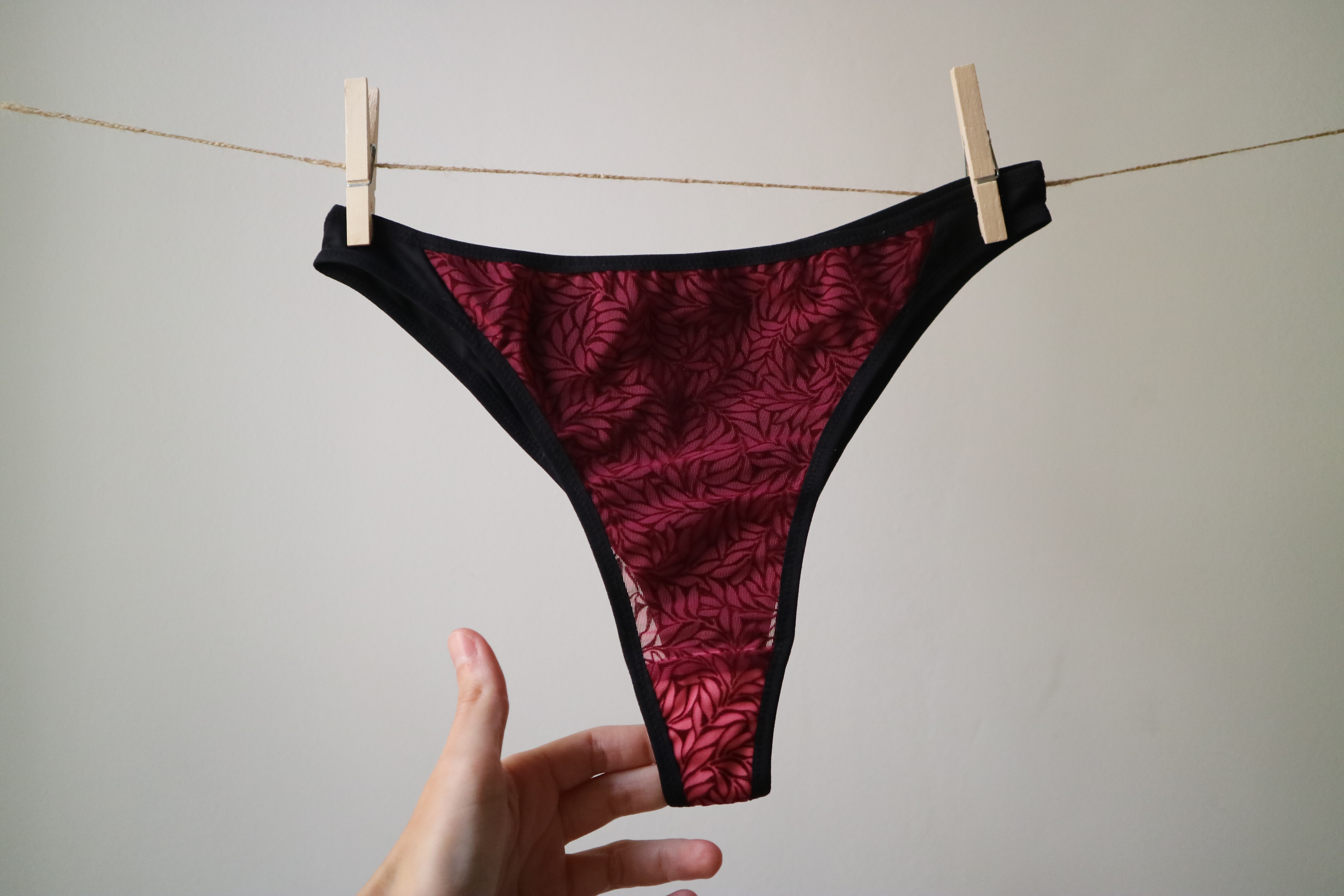 Culotte string bicolore avec une coupe oblique qui affine la silhouette.