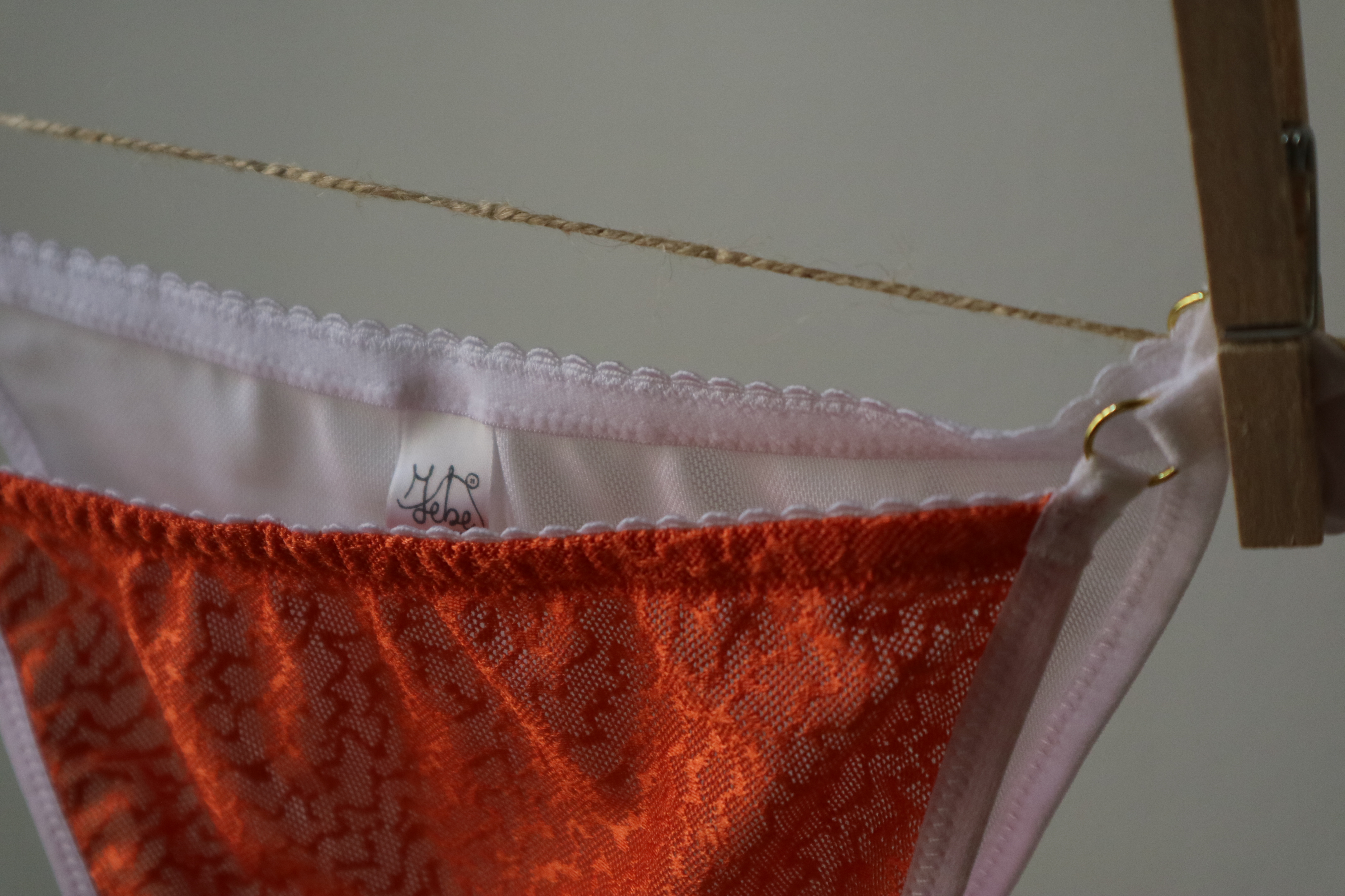 Culotte tanga avec des liens réglables sur les côtés. L’échancrure à l’arrière est assez profonde.
